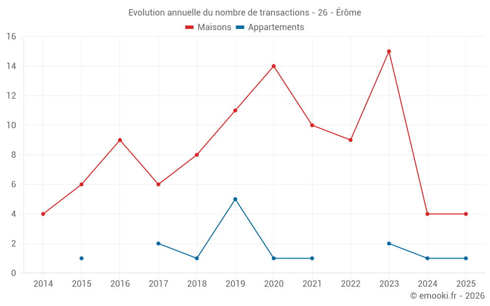 Le prix médian sur les 15 transactions de maisons des 24 derniers mois dans la commune d'Érôme était de 2 327 € par mètre carré pour une valeur foncière médiane de 162 000 €. Sur cette période 60% des transactions se sont situées entre 1 363 et 2 617 € par mètre carré (du 2ème au 8ème déciles).