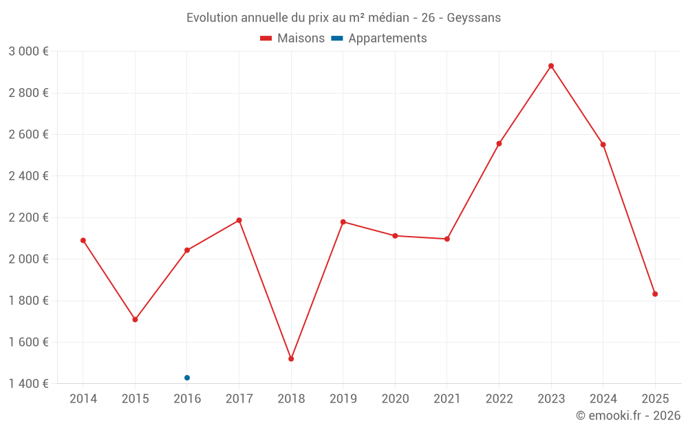 Le prix médian sur les 16 transactions de maisons des 24 derniers mois dans la commune de Geyssans était de 2 430 € par mètre carré pour une valeur foncière médiane de 286 800 €. Sur cette période 60% des transactions se sont situées entre 1 832 et 3 319 € par mètre carré (du 2ème au 8ème déciles).