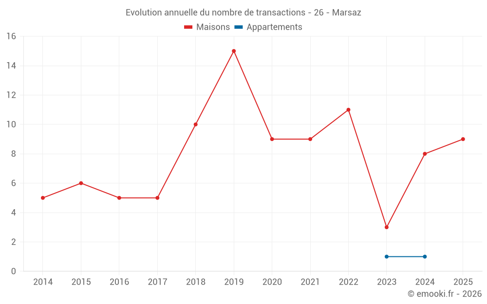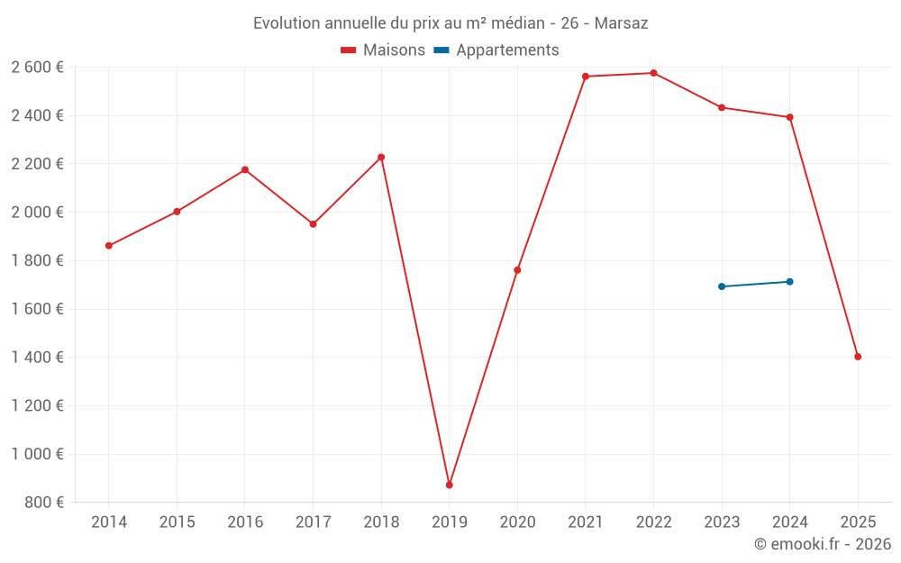 Le prix médian sur les 19 transactions de maisons des 24 derniers mois dans la commune de Marsaz était de 2 000 € par mètre carré pour une valeur foncière médiane de 206 650 €. Sur cette période 60% des transactions se sont situées entre 1 365 et 2 557 € par mètre carré (du 2ème au 8ème déciles).