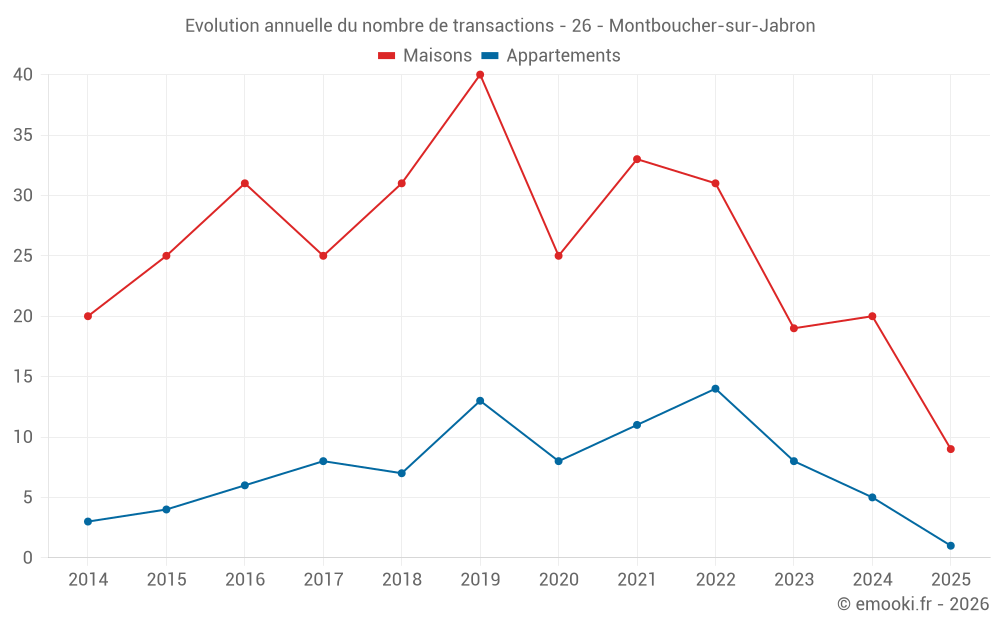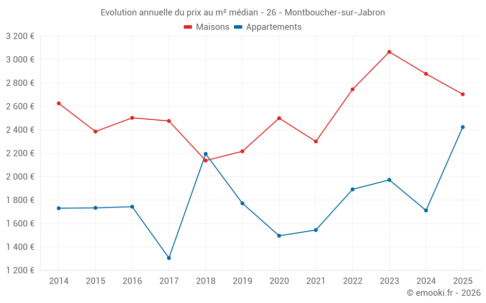 Le prix médian sur les 18 transactions de maisons des 12 derniers mois dans la commune de Montboucher-sur-Jabron était de 2 726 € par mètre carré pour une valeur foncière médiane de 326 450 €. Sur cette période 60% des transactions se sont situées entre 2 183 et 3 119 € par mètre carré (du 2ème au 8ème déciles).