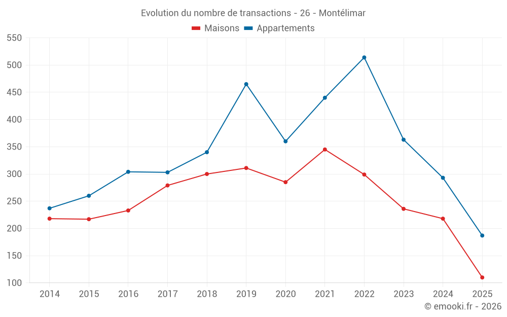 Le prix médian sur les 50 transactions de maisons des 3 derniers mois dans la commune de Montélimar était de 2 574 € par mètre carré pour une valeur foncière médiane de 269 000 €. Sur cette période 60% des transactions se sont situées entre 2 214 et 3 225 € par mètre carré (du 2ème au 8ème déciles).