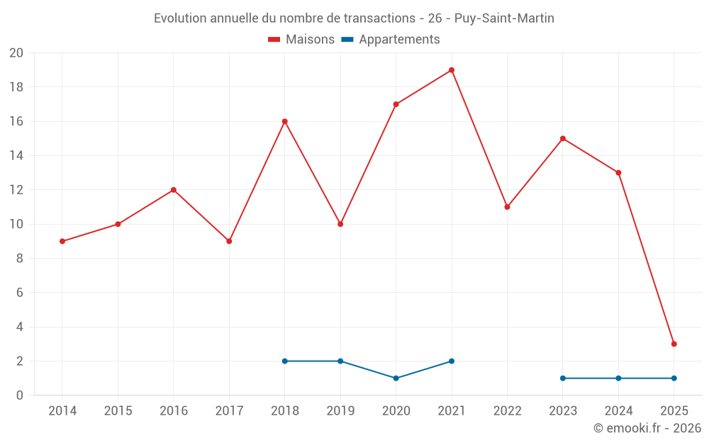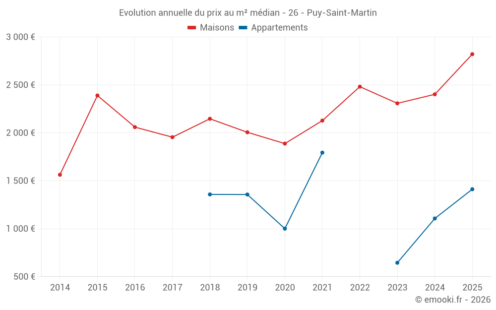 Le prix médian sur les 23 transactions de maisons des 24 derniers mois dans la commune de Puy-Saint-Martin était de 2 402 € par mètre carré pour une valeur foncière médiane de 269 000 €. Sur cette période 60% des transactions se sont situées entre 1 516 et 3 098 € par mètre carré (du 2ème au 8ème déciles).