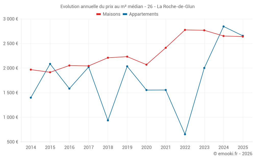Le prix médian sur les 30 transactions de maisons des 12 derniers mois dans la commune de la Roche-de-Glun était de 2 658 € par mètre carré pour une valeur foncière médiane de 273 750 €. Sur cette période 60% des transactions se sont situées entre 2 170 et 2 968 € par mètre carré (du 2ème au 8ème déciles).