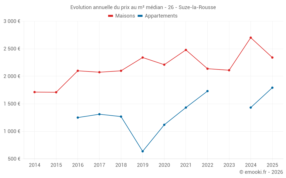 Le prix médian sur les 26 transactions de maisons des 12 derniers mois dans la commune de Suze-la-Rousse était de 2 700 € par mètre carré pour une valeur foncière médiane de 260 000 €. Sur cette période 60% des transactions se sont situées entre 2 302 et 3 211 € par mètre carré (du 2ème au 8ème déciles).