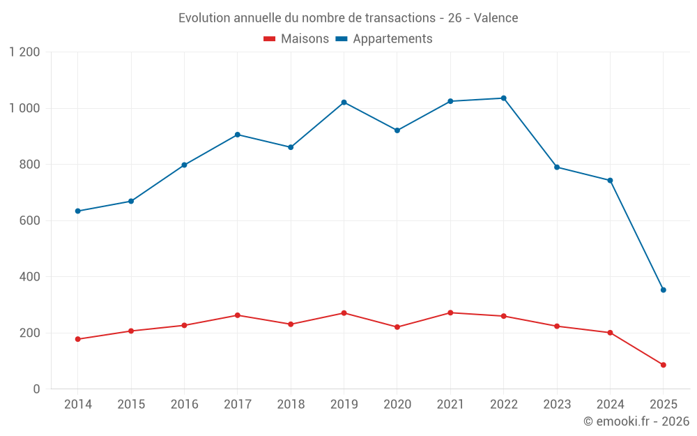 Le prix médian sur les 166 transactions d'appartements des 3 derniers mois dans la commune de Valence était de 1 911 € par mètre carré pour une valeur foncière médiane de 125 000 €. Sur cette période 60% des transactions se sont situées entre 1 471 et 2 610 € par mètre carré (du 2ème au 8ème déciles).