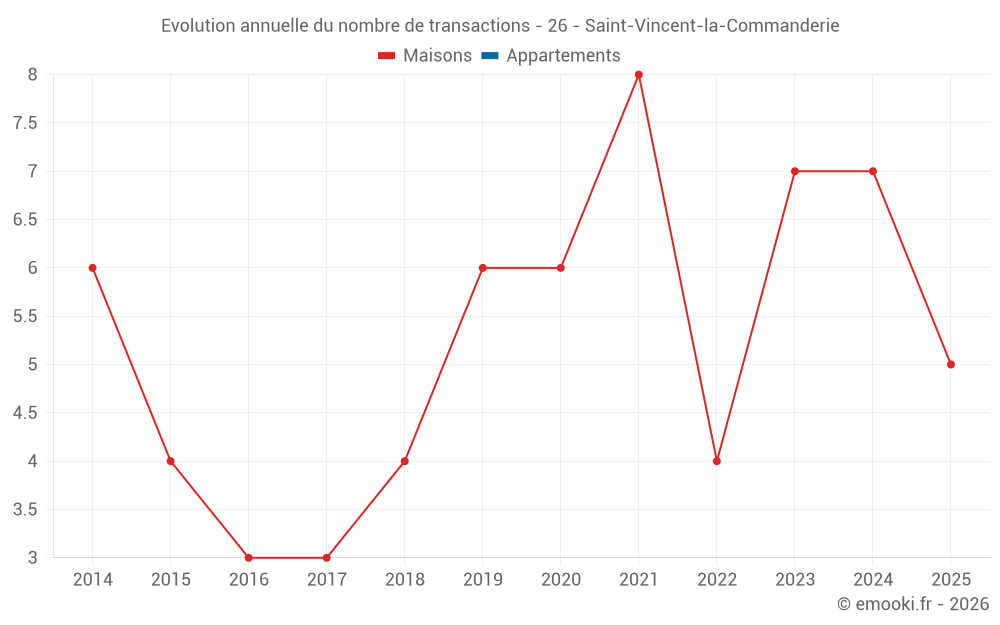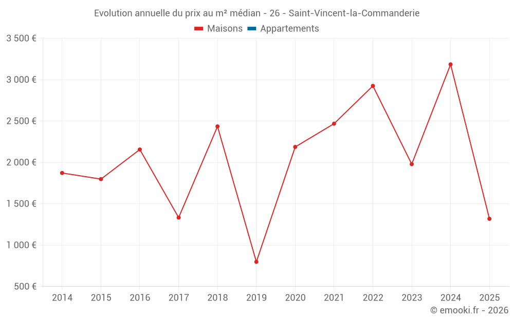 Le prix médian sur les 16 transactions de maisons des 24 derniers mois dans la commune de Saint-Vincent-la-Commanderie était de 2 117 € par mètre carré pour une valeur foncière médiane de 195 000 €. Sur cette période 60% des transactions se sont situées entre 1 318 et 3 199 € par mètre carré (du 2ème au 8ème déciles).