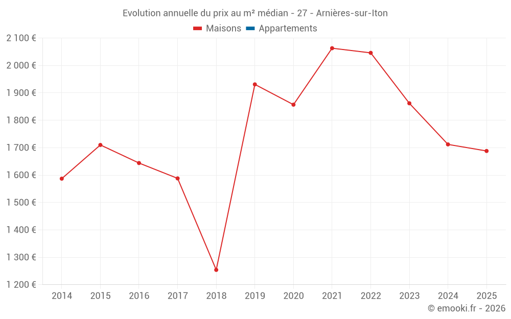Le prix médian sur les 18 transactions de maisons des 12 derniers mois dans la commune d'Arnières-sur-Iton était de 1 714 € par mètre carré pour une valeur foncière médiane de 200 350 €. Sur cette période 60% des transactions se sont situées entre 1 571 et 2 165 € par mètre carré (du 2ème au 8ème déciles).