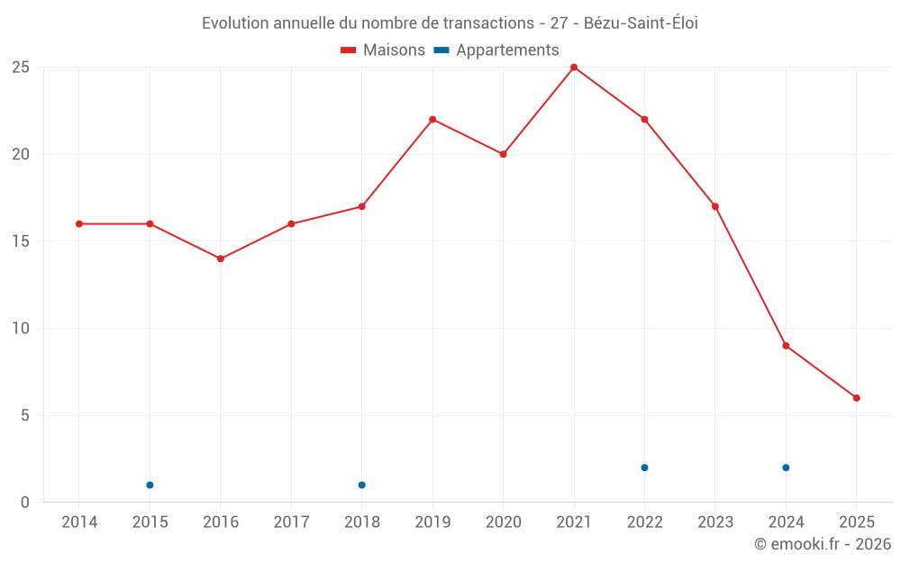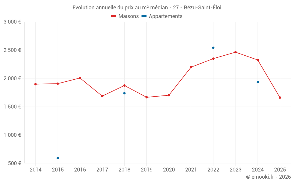 Le prix médian sur les 25 transactions de maisons des 24 derniers mois dans la commune de Bézu-Saint-Éloi était de 2 167 € par mètre carré pour une valeur foncière médiane de 186 200 €. Sur cette période 60% des transactions se sont situées entre 1 620 et 2 775 € par mètre carré (du 2ème au 8ème déciles).