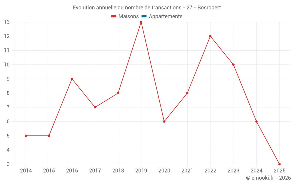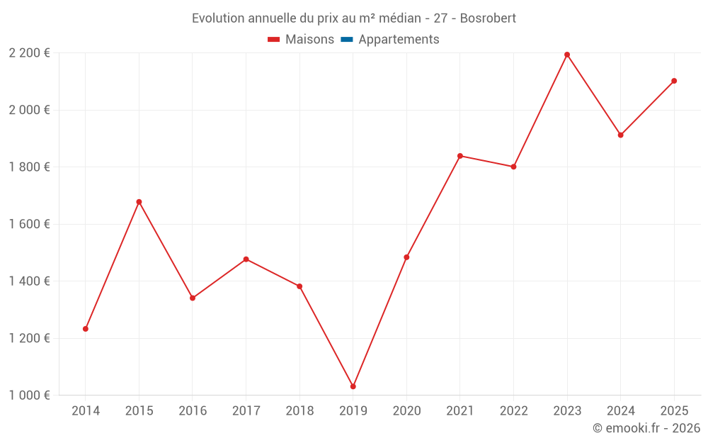 Le prix médian sur les 16 transactions de maisons des 24 derniers mois dans la commune de Bosrobert était de 2 070 € par mètre carré pour une valeur foncière médiane de 182 500 €. Sur cette période 60% des transactions se sont situées entre 1 756 et 2 424 € par mètre carré (du 2ème au 8ème déciles).