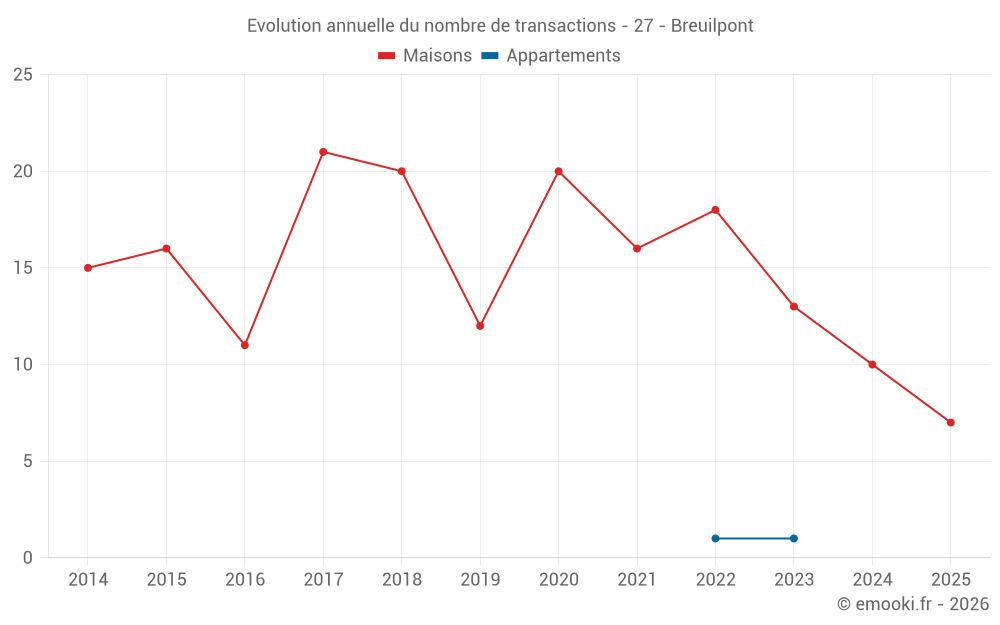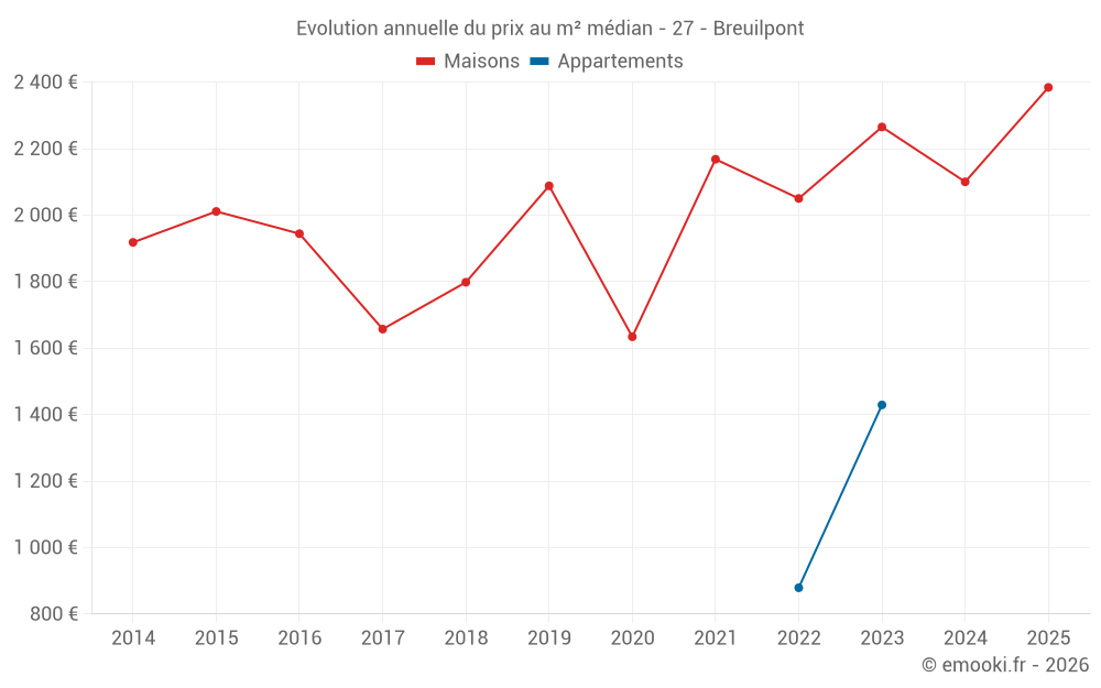 Le prix médian sur les 25 transactions de maisons des 24 derniers mois dans la commune de Breuilpont était de 2 203 € par mètre carré pour une valeur foncière médiane de 240 000 €. Sur cette période 60% des transactions se sont situées entre 1 712 et 2 498 € par mètre carré (du 2ème au 8ème déciles).