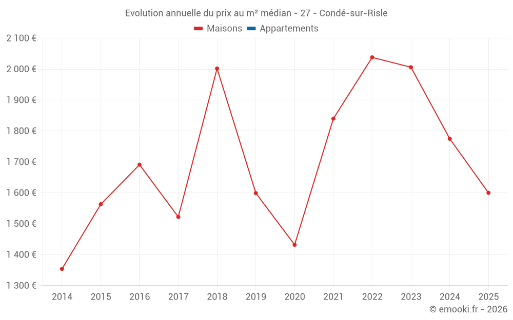 Le prix médian sur les 17 transactions de maisons des 24 derniers mois dans la commune de Condé-sur-Risle était de 1 775 € par mètre carré pour une valeur foncière médiane de 159 750 €. Sur cette période 60% des transactions se sont situées entre 1 320 et 2 192 € par mètre carré (du 2ème au 8ème déciles).