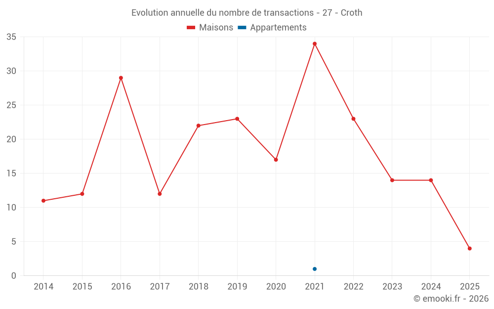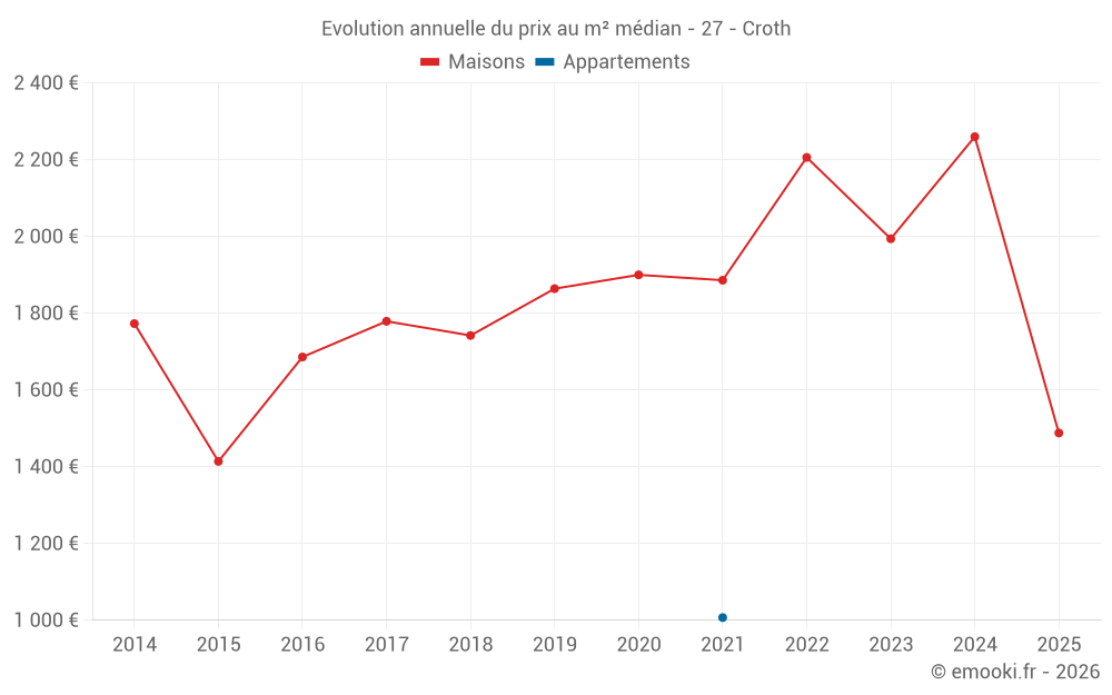 Le prix médian sur les 22 transactions de maisons des 24 derniers mois dans la commune de Croth était de 1 994 € par mètre carré pour une valeur foncière médiane de 158 475 €. Sur cette période 60% des transactions se sont situées entre 1 234 et 2 345 € par mètre carré (du 2ème au 8ème déciles).