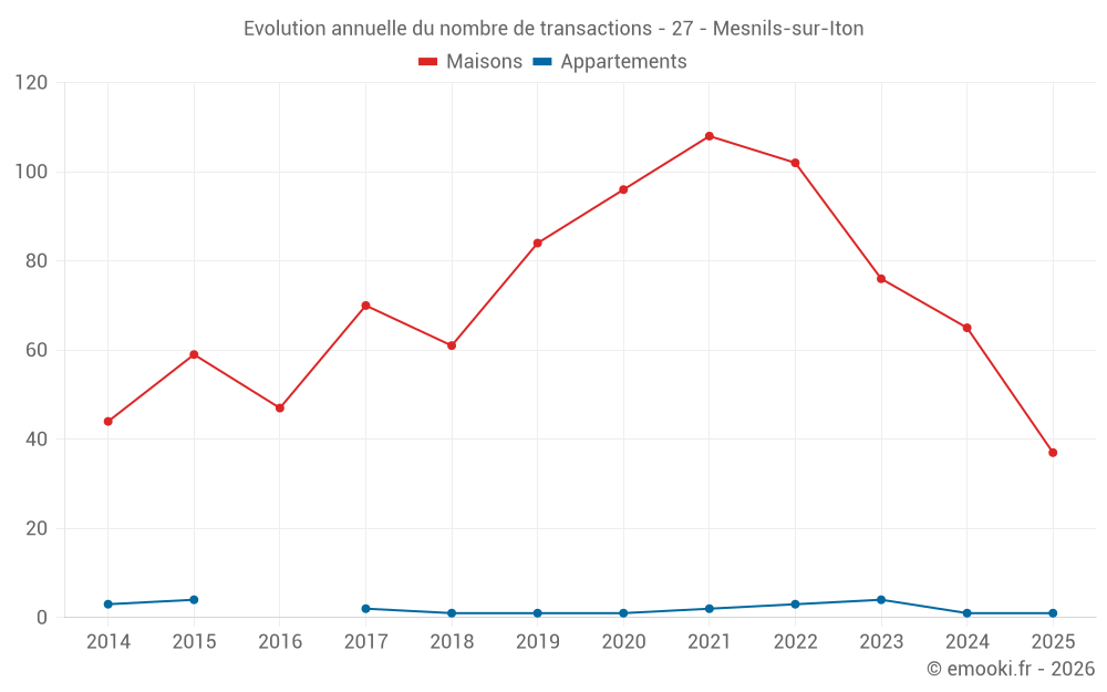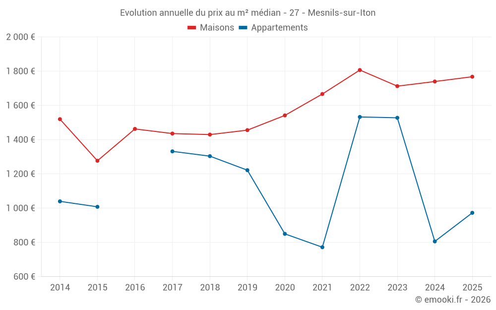 Le prix médian sur les 22 transactions de maisons des 3 derniers mois dans la commune de Mesnils-sur-Iton était de 1 878 € par mètre carré pour une valeur foncière médiane de 143 902 €. Sur cette période 60% des transactions se sont situées entre 1 033 et 2 166 € par mètre carré (du 2ème au 8ème déciles).