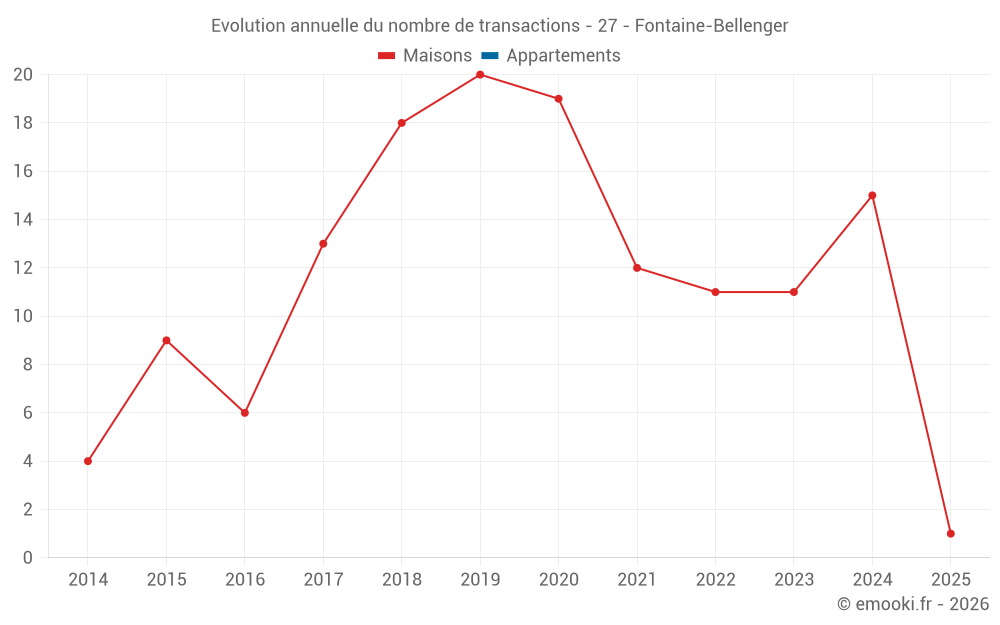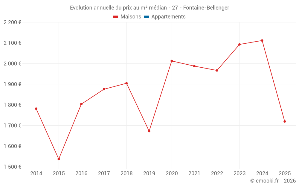 Le prix médian sur les 23 transactions de maisons des 24 derniers mois dans la commune de Fontaine-Bellenger était de 2 089 € par mètre carré pour une valeur foncière médiane de 181 500 €. Sur cette période 60% des transactions se sont situées entre 1 814 et 2 413 € par mètre carré (du 2ème au 8ème déciles).