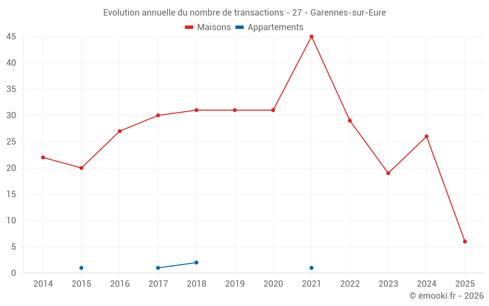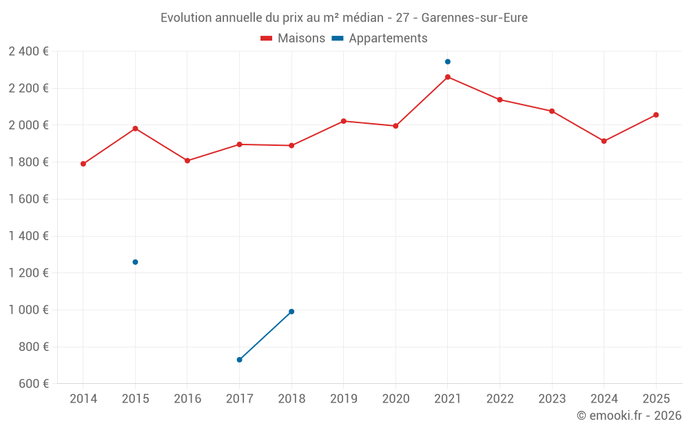 Le prix médian sur les 20 transactions de maisons des 12 derniers mois dans la commune de Garennes-sur-Eure était de 2 080 € par mètre carré pour une valeur foncière médiane de 181 000 €. Sur cette période 60% des transactions se sont situées entre 1 667 et 2 360 € par mètre carré (du 2ème au 8ème déciles).
