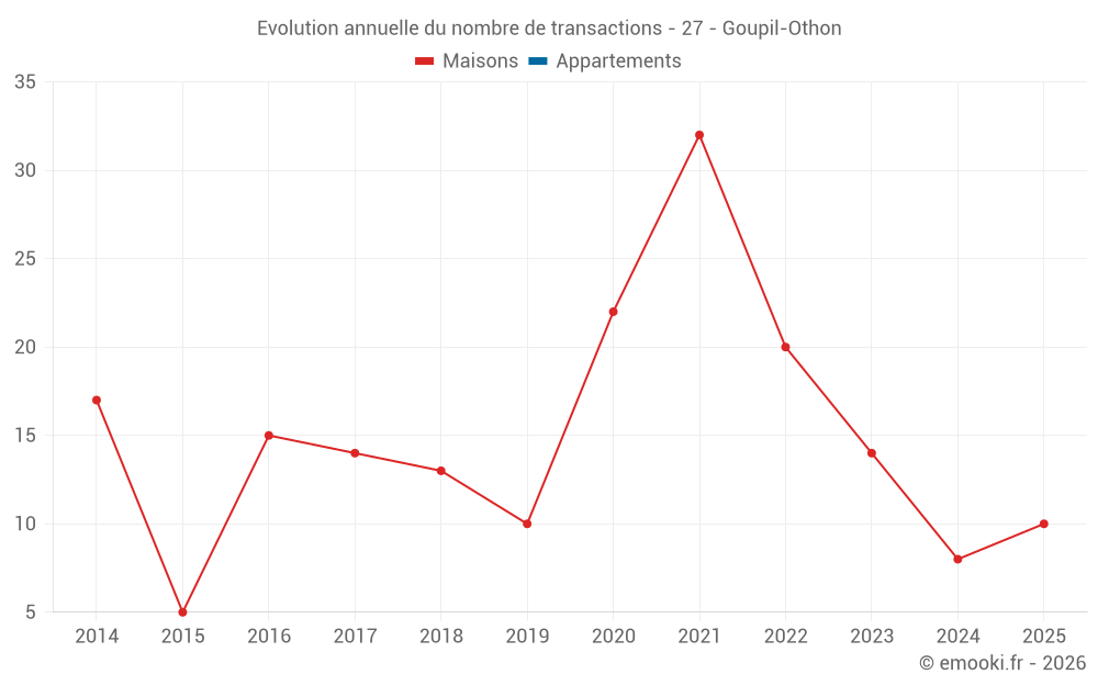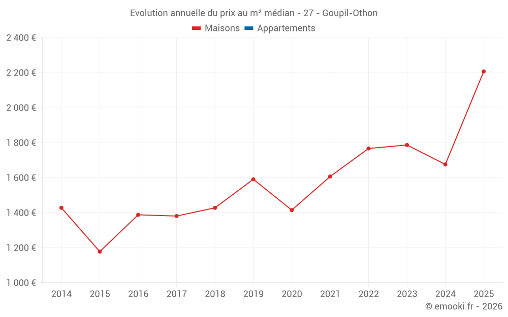 Le prix médian sur les 16 transactions de maisons des 12 derniers mois dans la commune de Goupil-Othon était de 1 843 € par mètre carré pour une valeur foncière médiane de 177 500 €. Sur cette période 60% des transactions se sont situées entre 1 667 et 2 262 € par mètre carré (du 2ème au 8ème déciles).