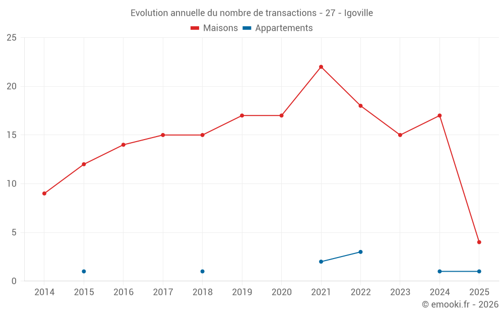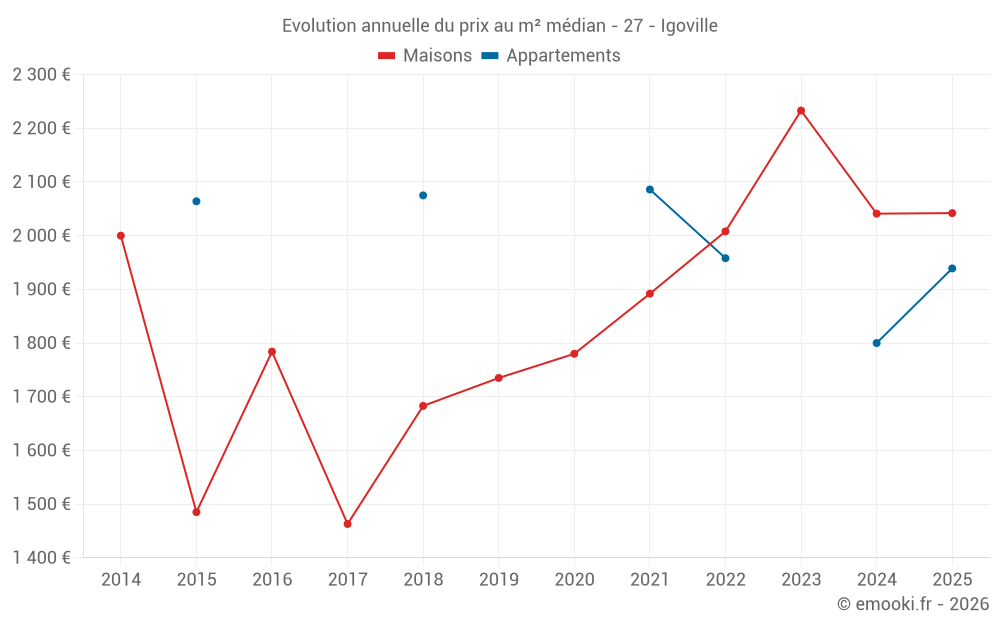 Le prix médian sur les 29 transactions de maisons des 24 derniers mois dans la commune d'Igoville était de 2 062 € par mètre carré pour une valeur foncière médiane de 208 000 €. Sur cette période 60% des transactions se sont situées entre 1 488 et 2 549 € par mètre carré (du 2ème au 8ème déciles).