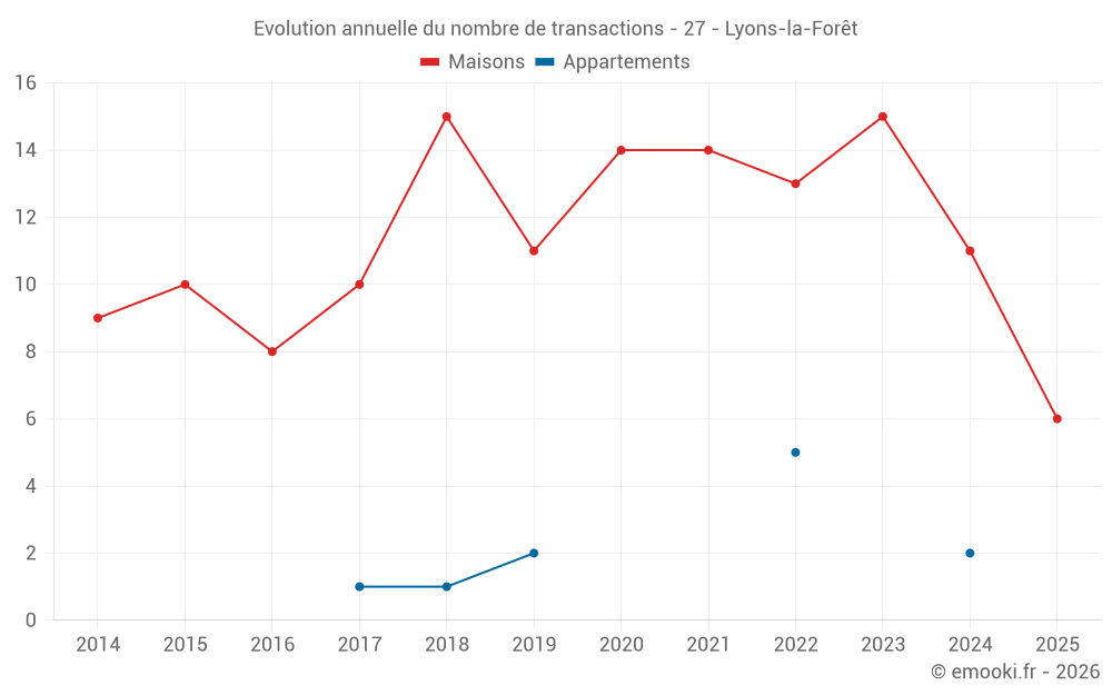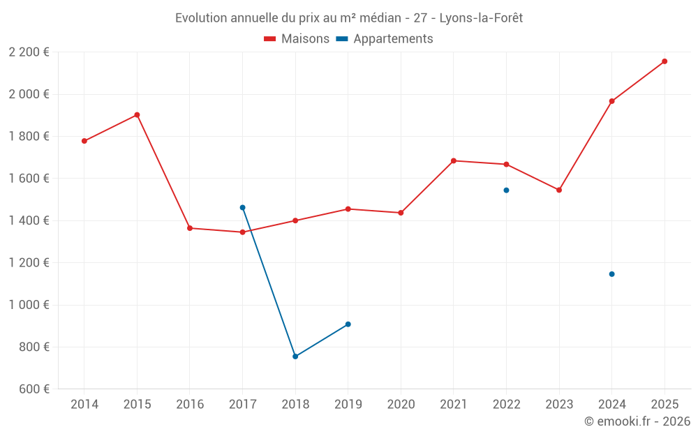 Le prix médian sur les 16 transactions de maisons des 12 derniers mois dans la commune de Lyons-la-Forêt était de 2 027 € par mètre carré pour une valeur foncière médiane de 147 500 €. Sur cette période 60% des transactions se sont situées entre 1 534 et 2 422 € par mètre carré (du 2ème au 8ème déciles).