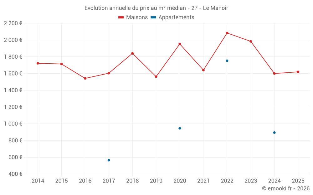 Le prix médian sur les 24 transactions de maisons des 24 derniers mois dans la commune du Manoir était de 1 693 € par mètre carré pour une valeur foncière médiane de 127 500 €. Sur cette période 60% des transactions se sont situées entre 1 204 et 2 205 € par mètre carré (du 2ème au 8ème déciles).