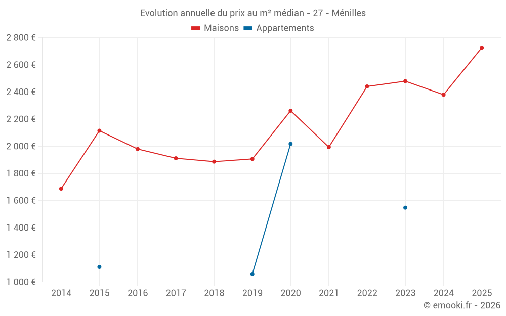 Le prix médian sur les 29 transactions de maisons des 24 derniers mois dans la commune de Ménilles était de 2 441 € par mètre carré pour une valeur foncière médiane de 232 000 €. Sur cette période 60% des transactions se sont situées entre 2 022 et 3 309 € par mètre carré (du 2ème au 8ème déciles).