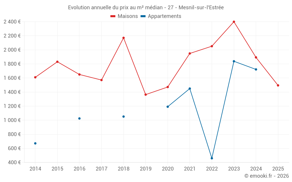 Le prix médian sur les 16 transactions de maisons des 24 derniers mois dans la commune de Mesnil-sur-l'Estrée était de 1 962 € par mètre carré pour une valeur foncière médiane de 175 000 €. Sur cette période 60% des transactions se sont situées entre 1 495 et 2 108 € par mètre carré (du 2ème au 8ème déciles).