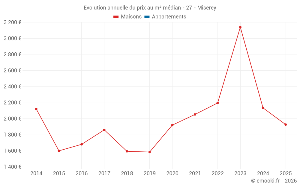 Le prix médian sur les 18 transactions de maisons des 24 derniers mois dans la commune de Miserey était de 2 162 € par mètre carré pour une valeur foncière médiane de 217 000 €. Sur cette période 60% des transactions se sont situées entre 1 766 et 2 717 € par mètre carré (du 2ème au 8ème déciles).