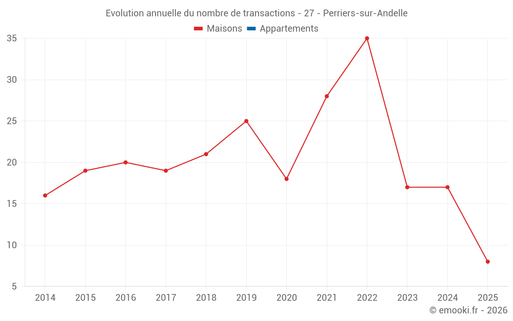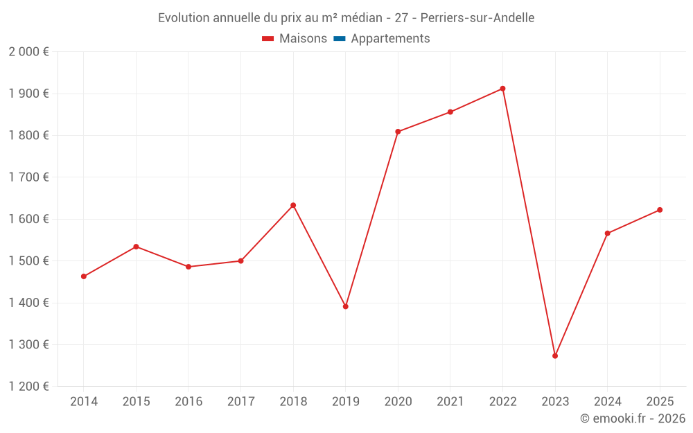 Le prix médian sur les 17 transactions de maisons des 12 derniers mois dans la commune de Perriers-sur-Andelle était de 1 417 € par mètre carré pour une valeur foncière médiane de 170 000 €. Sur cette période 60% des transactions se sont situées entre 1 224 et 2 119 € par mètre carré (du 2ème au 8ème déciles).