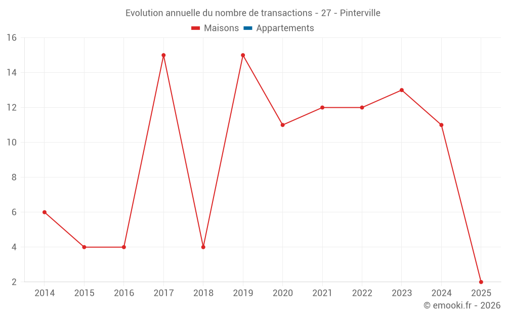 Le prix médian sur les 21 transactions de maisons des 24 derniers mois dans la commune de Pinterville était de 2 143 € par mètre carré pour une valeur foncière médiane de 197 500 €. Sur cette période 60% des transactions se sont situées entre 1 672 et 2 395 € par mètre carré (du 2ème au 8ème déciles).