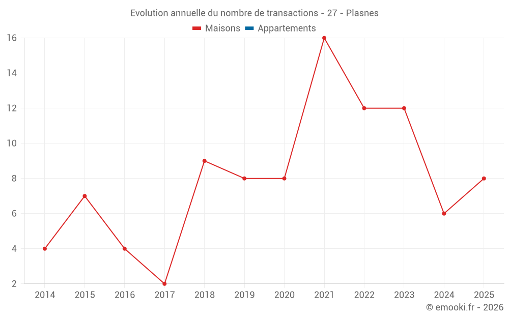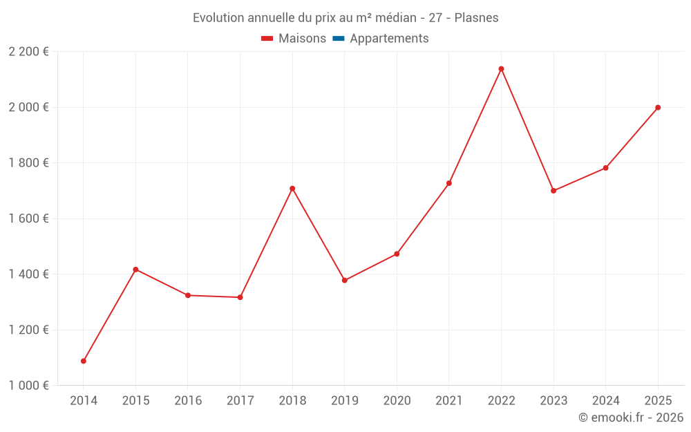 Le prix médian sur les 22 transactions de maisons des 24 derniers mois dans la commune de Plasnes était de 1 786 € par mètre carré pour une valeur foncière médiane de 193 838 €. Sur cette période 60% des transactions se sont situées entre 1 488 et 2 197 € par mètre carré (du 2ème au 8ème déciles).