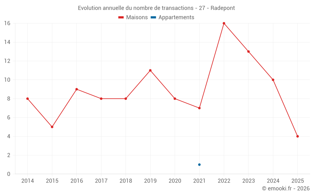 Le prix médian sur les 23 transactions de maisons des 24 derniers mois dans la commune de Radepont était de 1 719 € par mètre carré pour une valeur foncière médiane de 145 000 €. Sur cette période 60% des transactions se sont situées entre 1 346 et 2 074 € par mètre carré (du 2ème au 8ème déciles).