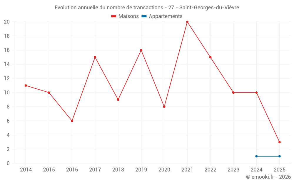 Le prix médian sur les 19 transactions de maisons des 24 derniers mois dans la commune de Saint-Georges-du-Vièvre était de 1 482 € par mètre carré pour une valeur foncière médiane de 159 000 €. Sur cette période 60% des transactions se sont situées entre 1 031 et 2 091 € par mètre carré (du 2ème au 8ème déciles).