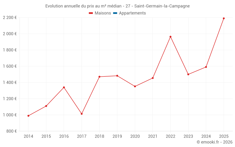 Le prix médian sur les 28 transactions de maisons des 24 derniers mois dans la commune de Saint-Germain-la-Campagne était de 1 699 € par mètre carré pour une valeur foncière médiane de 155 675 €. Sur cette période 60% des transactions se sont situées entre 1 279 et 2 247 € par mètre carré (du 2ème au 8ème déciles).