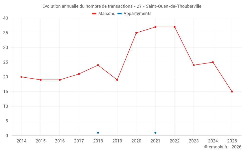 Le prix médian sur les 33 transactions de maisons des 12 derniers mois dans la commune de Saint-Ouen-de-Thouberville était de 1 967 € par mètre carré pour une valeur foncière médiane de 186 000 €. Sur cette période 60% des transactions se sont situées entre 1 704 et 2 401 € par mètre carré (du 2ème au 8ème déciles).