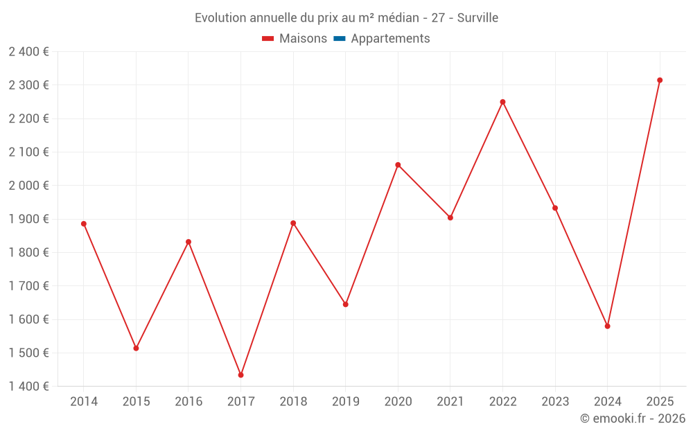 Le prix médian sur les 14 transactions de maisons des 24 derniers mois dans la commune de Surville était de 1 714 € par mètre carré pour une valeur foncière médiane de 163 000 €. Sur cette période 60% des transactions se sont situées entre 1 372 et 2 178 € par mètre carré (du 2ème au 8ème déciles).