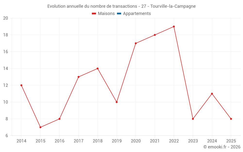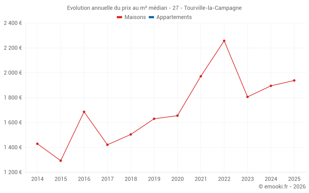 Le prix médian sur les 23 transactions de maisons des 24 derniers mois dans la commune de Tourville-la-Campagne était de 1 819 € par mètre carré pour une valeur foncière médiane de 211 300 €. Sur cette période 60% des transactions se sont situées entre 1 689 et 2 479 € par mètre carré (du 2ème au 8ème déciles).