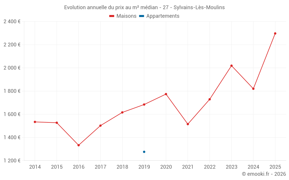 Le prix médian sur les 23 transactions de maisons des 24 derniers mois dans la commune de Sylvains-Lès-Moulins était de 1 910 € par mètre carré pour une valeur foncière médiane de 217 000 €. Sur cette période 60% des transactions se sont situées entre 1 632 et 2 555 € par mètre carré (du 2ème au 8ème déciles).