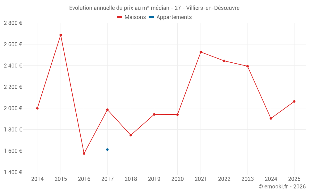 Le prix médian sur les 21 transactions de maisons des 24 derniers mois dans la commune de Villiers-en-Désœuvre était de 2 149 € par mètre carré pour une valeur foncière médiane de 225 000 €. Sur cette période 60% des transactions se sont situées entre 1 563 et 2 754 € par mètre carré (du 2ème au 8ème déciles).