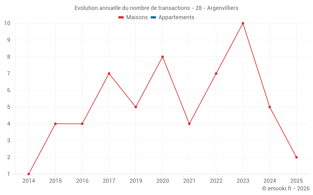 Le prix médian sur les 14 transactions de maisons des 24 derniers mois dans la commune d'Argenvilliers était de 1 070 € par mètre carré pour une valeur foncière médiane de 98 475 €. Sur cette période 60% des transactions se sont situées entre 378 et 1 938 € par mètre carré (du 2ème au 8ème déciles).