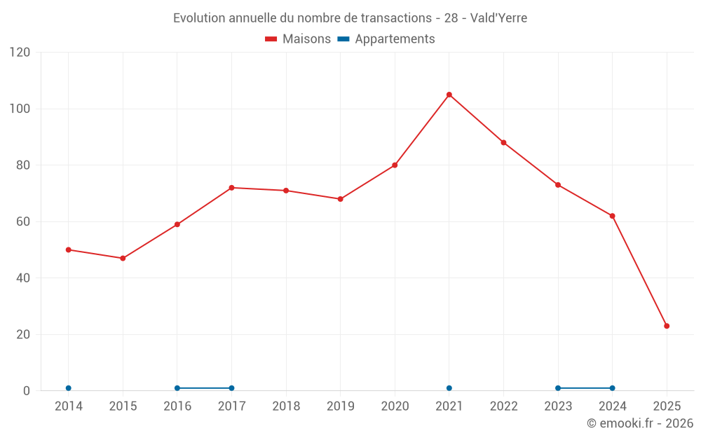 Le prix médian sur les 23 transactions de maisons des 6 derniers mois dans la commune de Vald'Yerre était de 1 180 € par mètre carré pour une valeur foncière médiane de 129 000 €. Sur cette période 60% des transactions se sont situées entre 895 et 1 495 € par mètre carré (du 2ème au 8ème déciles).