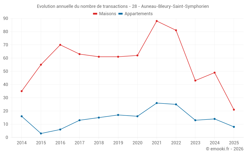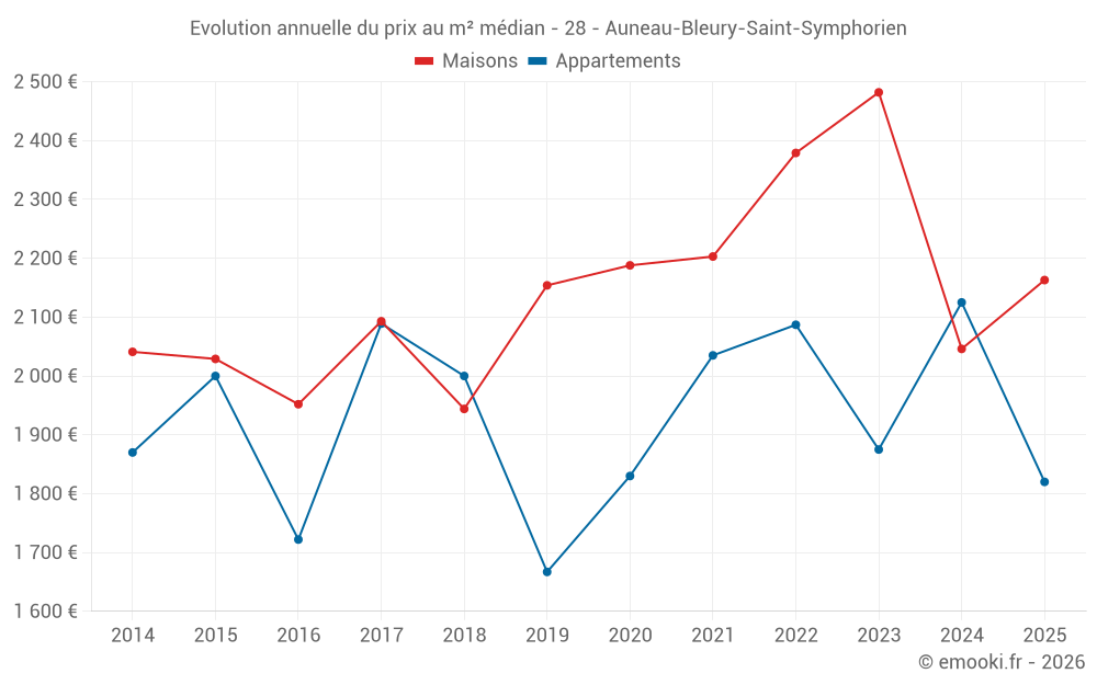 Le prix médian sur les 21 transactions de maisons des 6 derniers mois dans la commune d'Auneau-Bleury-Saint-Symphorien était de 2 163 € par mètre carré pour une valeur foncière médiane de 237 900 €. Sur cette période 60% des transactions se sont situées entre 1 379 et 2 522 € par mètre carré (du 2ème au 8ème déciles).