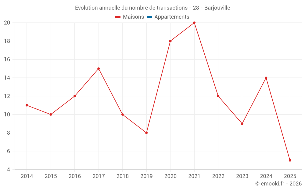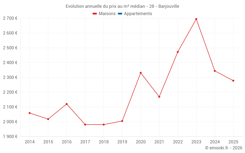 Le prix médian sur les 26 transactions de maisons des 24 derniers mois dans la commune de Barjouville était de 2 560 € par mètre carré pour une valeur foncière médiane de 238 000 €. Sur cette période 60% des transactions se sont situées entre 2 031 et 3 125 € par mètre carré (du 2ème au 8ème déciles).