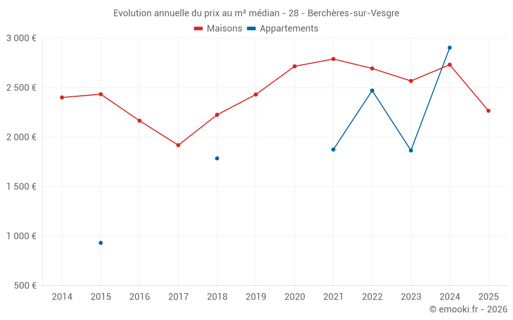 Le prix médian sur les 14 transactions de maisons des 24 derniers mois dans la commune de Berchères-sur-Vesgre était de 2 643 € par mètre carré pour une valeur foncière médiane de 246 975 €. Sur cette période 60% des transactions se sont situées entre 2 276 et 3 533 € par mètre carré (du 2ème au 8ème déciles).