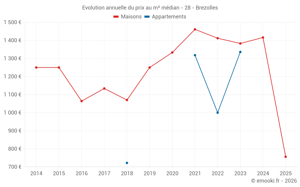 Le prix médian sur les 25 transactions de maisons des 24 derniers mois dans la commune de Brezolles était de 1 346 € par mètre carré pour une valeur foncière médiane de 115 000 €. Sur cette période 60% des transactions se sont situées entre 874 et 1 671 € par mètre carré (du 2ème au 8ème déciles).