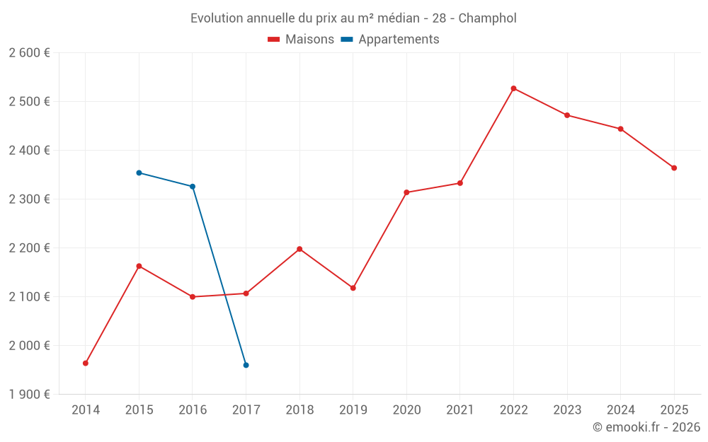 Le prix médian sur les 19 transactions de maisons des 12 derniers mois dans la commune de Champhol était de 2 364 € par mètre carré pour une valeur foncière médiane de 260 000 €. Sur cette période 60% des transactions se sont situées entre 1 899 et 3 213 € par mètre carré (du 2ème au 8ème déciles).