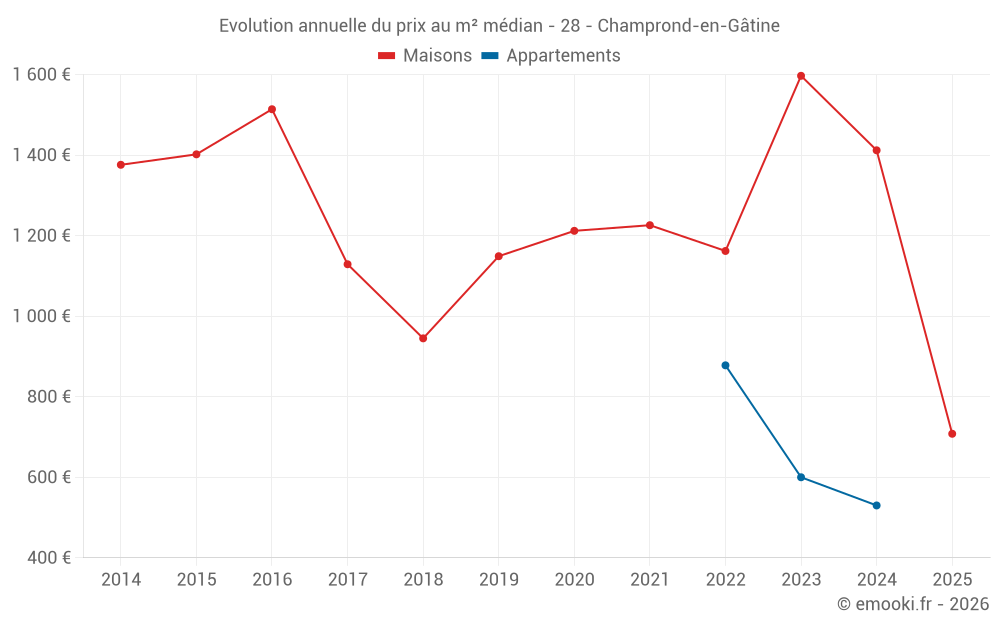 Le prix médian sur les 15 transactions de maisons des 24 derniers mois dans la commune de Champrond-en-Gâtine était de 1 387 € par mètre carré pour une valeur foncière médiane de 122 000 €. Sur cette période 60% des transactions se sont situées entre 1 130 et 1 611 € par mètre carré (du 2ème au 8ème déciles).