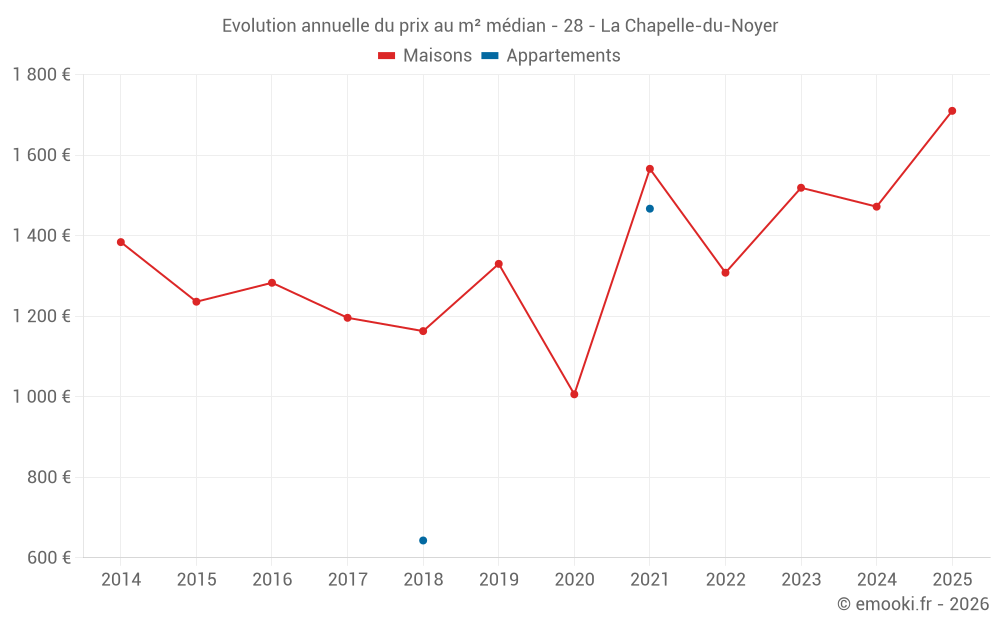 Le prix médian sur les 30 transactions de maisons des 24 derniers mois dans la commune de la Chapelle-du-Noyer était de 1 528 € par mètre carré pour une valeur foncière médiane de 129 500 €. Sur cette période 60% des transactions se sont situées entre 1 086 et 1 878 € par mètre carré (du 2ème au 8ème déciles).