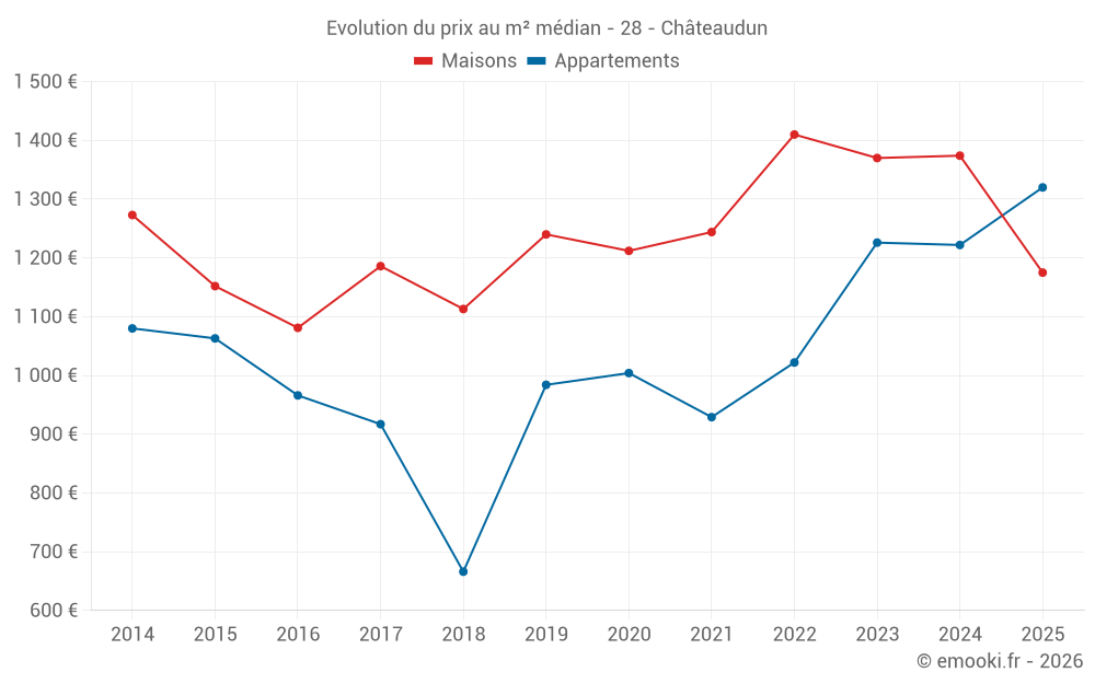 Le prix médian sur les 37 transactions de maisons des 6 derniers mois dans la commune de Châteaudun était de 1 175 € par mètre carré pour une valeur foncière médiane de 91 595 €. Sur cette période 60% des transactions se sont situées entre 920 et 1 618 € par mètre carré (du 2ème au 8ème déciles).