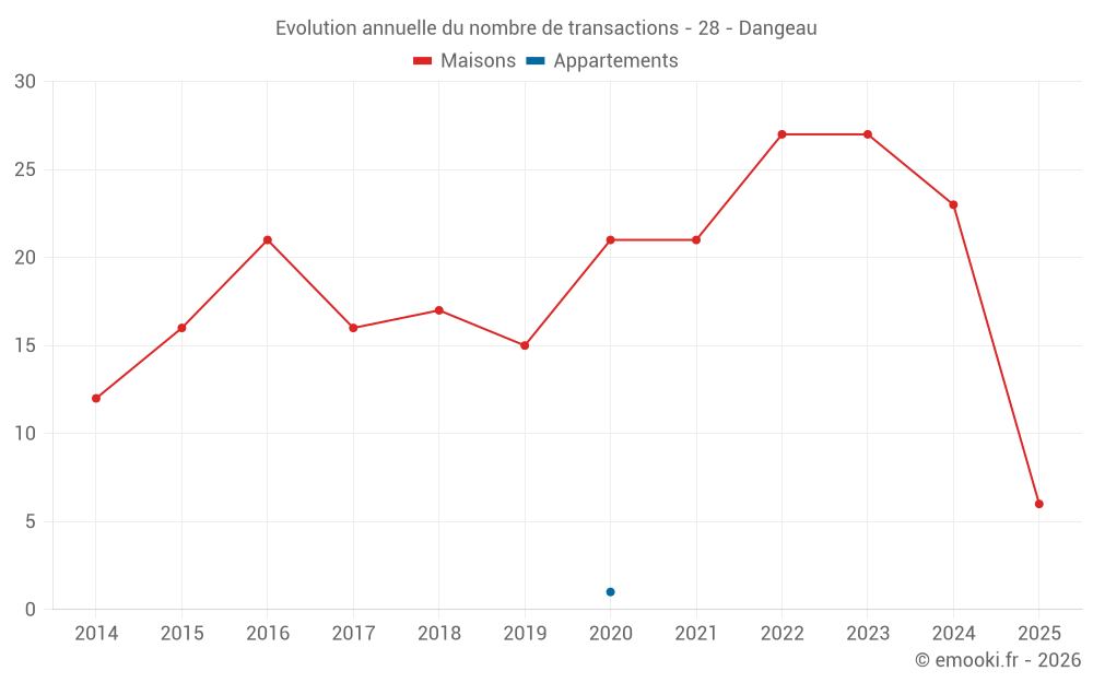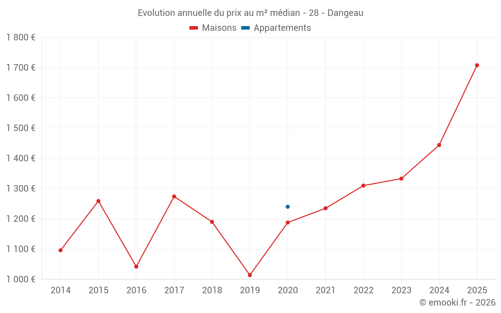 Le prix médian sur les 44 transactions de maisons des 24 derniers mois dans la commune de Dangeau était de 1 490 € par mètre carré pour une valeur foncière médiane de 112 075 €. Sur cette période 60% des transactions se sont situées entre 886 et 1 878 € par mètre carré (du 2ème au 8ème déciles).