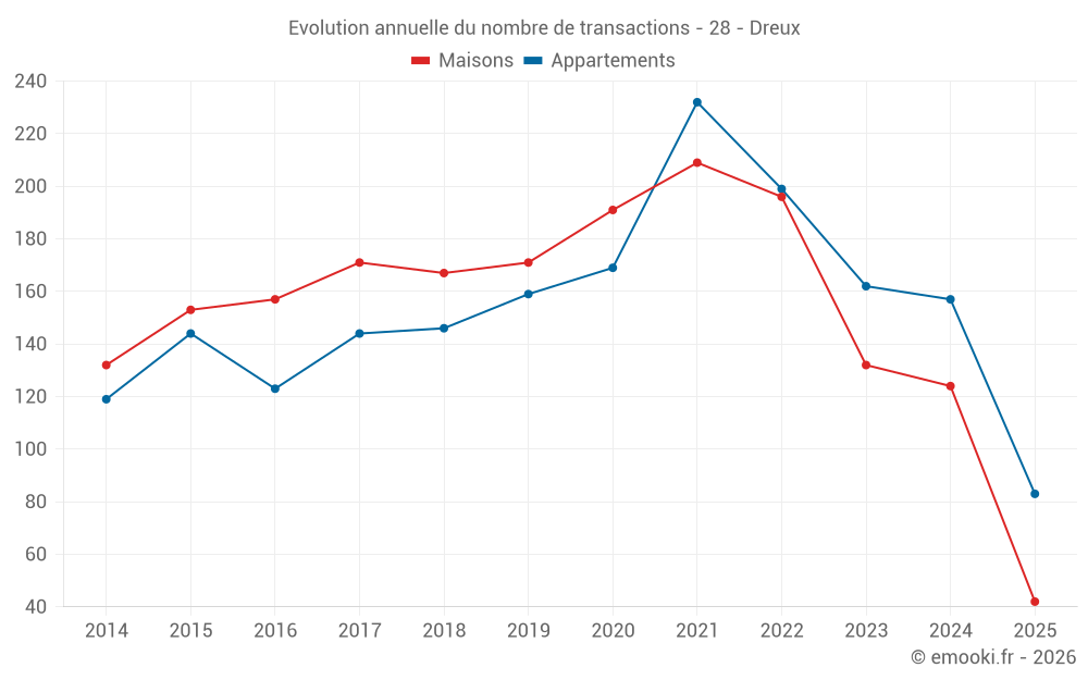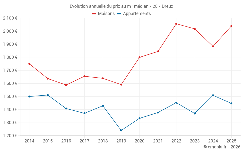 Le prix médian sur les 42 transactions de maisons des 6 derniers mois dans la commune de Dreux était de 2 040 € par mètre carré pour une valeur foncière médiane de 179 500 €. Sur cette période 60% des transactions se sont situées entre 1 580 et 2 453 € par mètre carré (du 2ème au 8ème déciles).
