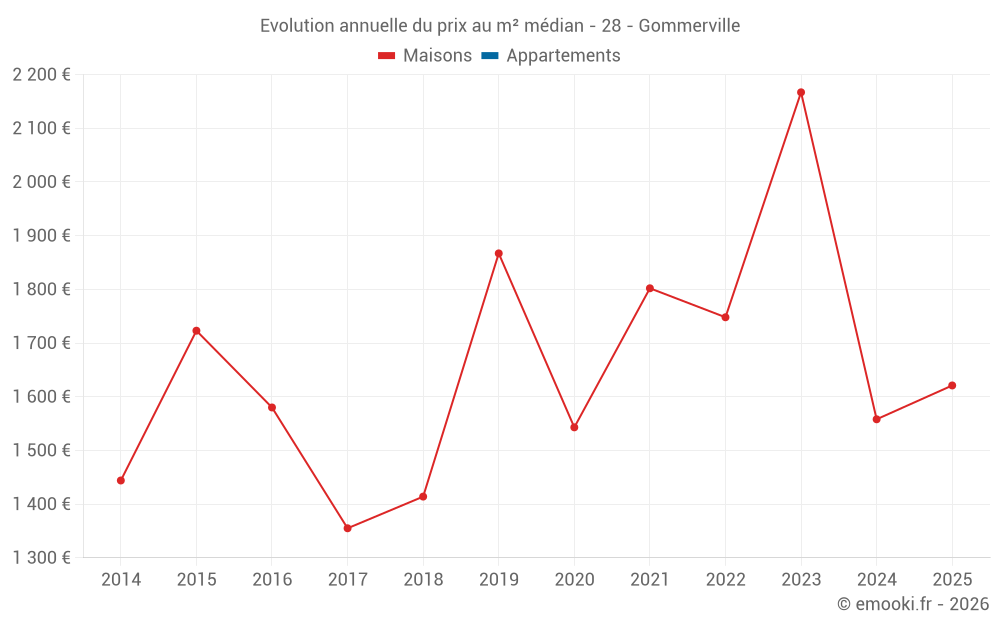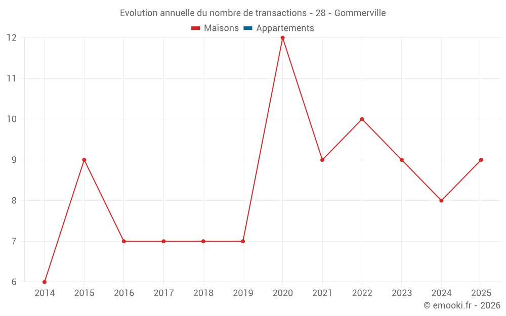 Le prix médian sur les 17 transactions de maisons des 24 derniers mois dans la commune de Gommerville était de 1 621 € par mètre carré pour une valeur foncière médiane de 170 000 €. Sur cette période 60% des transactions se sont situées entre 1 200 et 2 034 € par mètre carré (du 2ème au 8ème déciles).